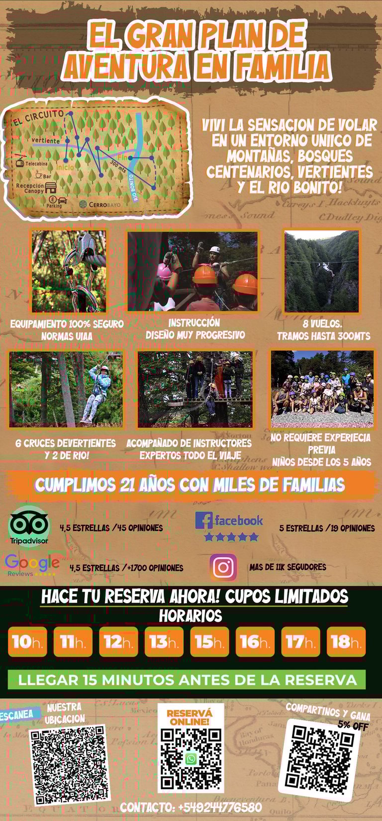 Es un viaje por la montaña sumergido en un bosque inmenso. Vamos “volando” de árbol en árbol, con plataformas construidas en las copas de los árboles. Guiados por instructores. En forma progresiva hacemos 8 tramos en 1200mts. De menor a mayor altura y distancia de los tramos. Todos se animan! Vamos cruzando cañadones vertientes y el Río Bonito. Nos equipamos con equipamiento homologado, tomamos una clase de instrucción donde aprendemos las normas básicas, cada uno va a poder regular su propia velocidad. Un tour espectacular para compartir en familia! Desde los 5 años.