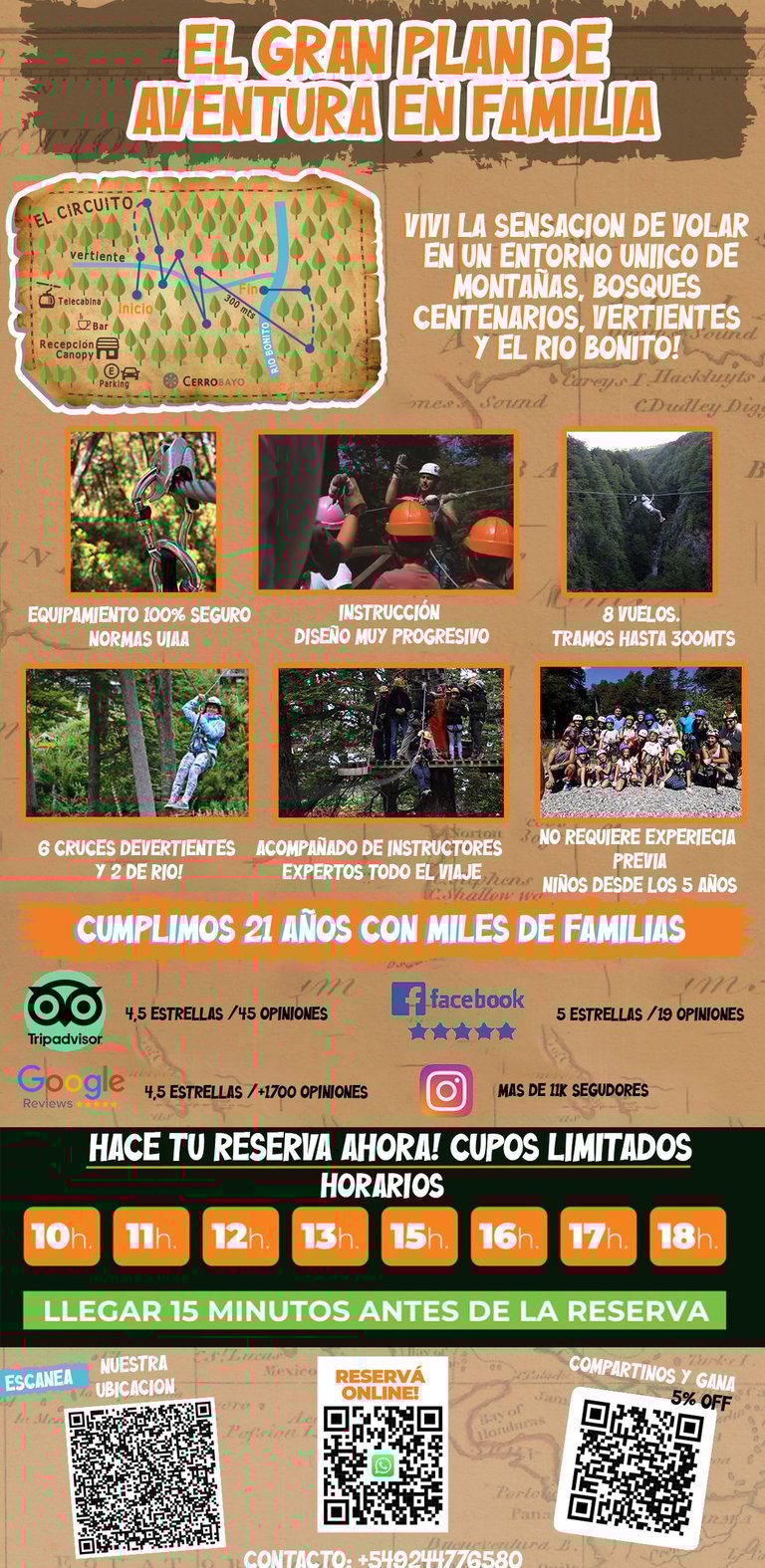 Seguridad: casco, arnés pélvico profesionales de escalada, mosquetones, cintas para anclaje, poleas de deslizamiento (PETZL), (todo el equipamiento homologado por la UUIA) guantes y manopla de cuero.* incluye seguro.